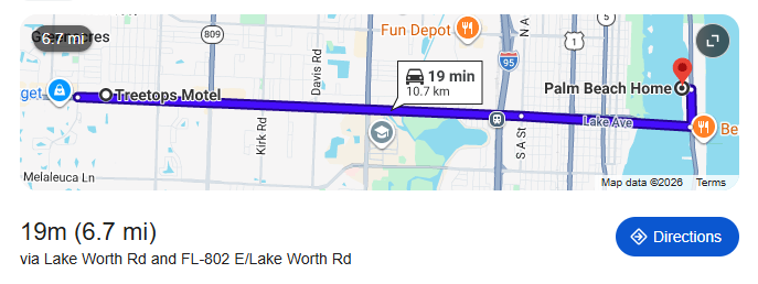 Distance from Treetops Motel to Epstein’s Palm Beach mansion