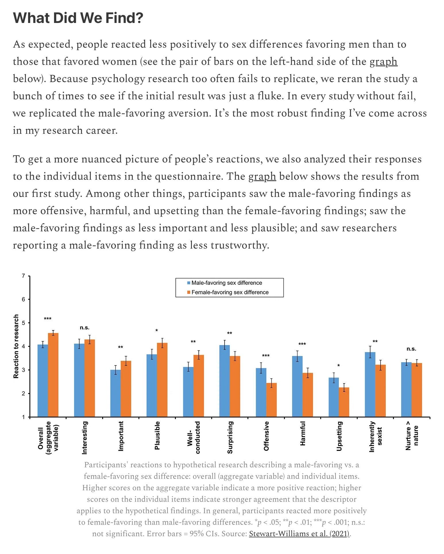 “As expected, people reacted less positively to sex differences favoring men than to those that favored women.”