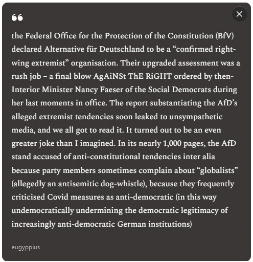 Germany has a very robust public sector; something like 12% of everyone works for the government. By going after AfD members who work for the state, left-leaning Minister Presidents and cabinet ministers hope to intimidate broad portions of the population away from supporting their political opponents. It is that blunt and stupid, what they are doing here.