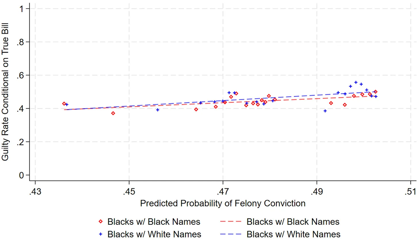 As shown in the graph below, Black defendants with stereotypically Black names are no more likely to be prosecuted than those with stereotypically White ones. (In the American grand jury system, the decision to prosecute is almost always made in the absence of the defendant.) The authors conclude that “racial bias explains at most 0.3 percent of the Black-White felony conviction gap.”