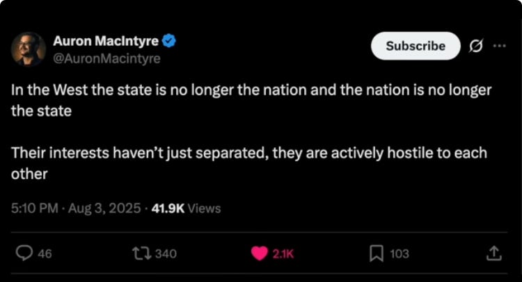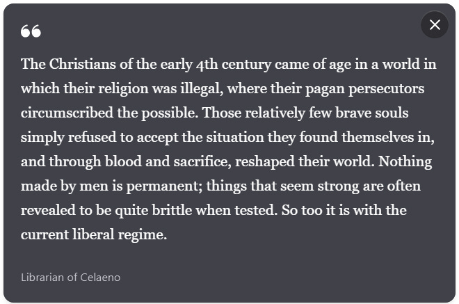 The normies are ready for a reckoning. They are not revolutionaries or counter-revolutionaries, but they want a just social order and they increasingly sense that one is not to be had under liberalism. They don’t process this on an intellectual level, but they feel like there is no way to vote themselves out of this. Stephen Miller’s rejection of trite ACLU pieties reflects, at a high level, the wish among the ordinary people of America for justice not in conflict with positive law. They don’t see the benefit of having their flag burned and their faith mocked and their heritage derided; the freedom they were supposed to enjoy in exchange, David French’s “blessings of liberty,” ring hollow now. It has been made very clear to them, if only intuitively, that there are millions of people who hate them, and would be happy to see them dead, if not actively participate in their liquidation, and that their innate good nature and willingness to leave people alone have resulted in a great barbarian horde that seeks nothing less than the wholesale destruction of their society.