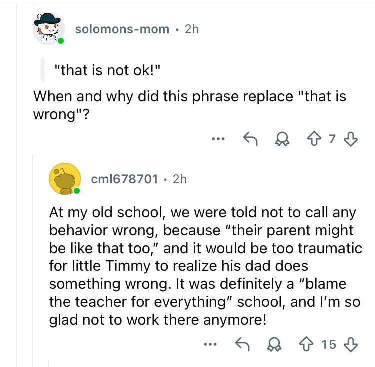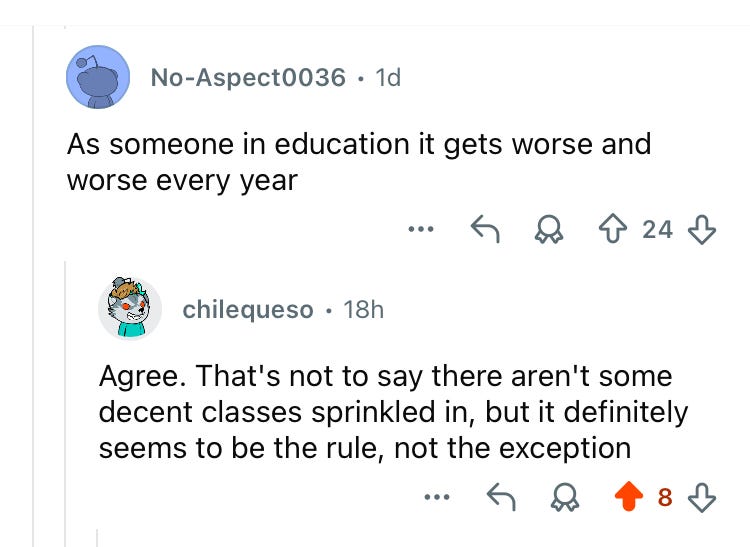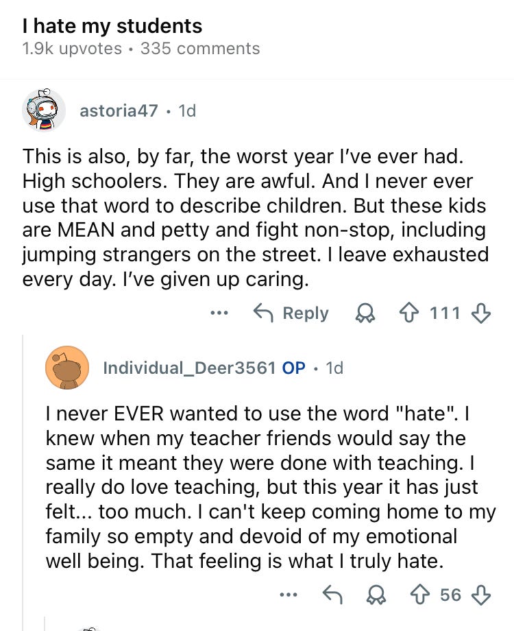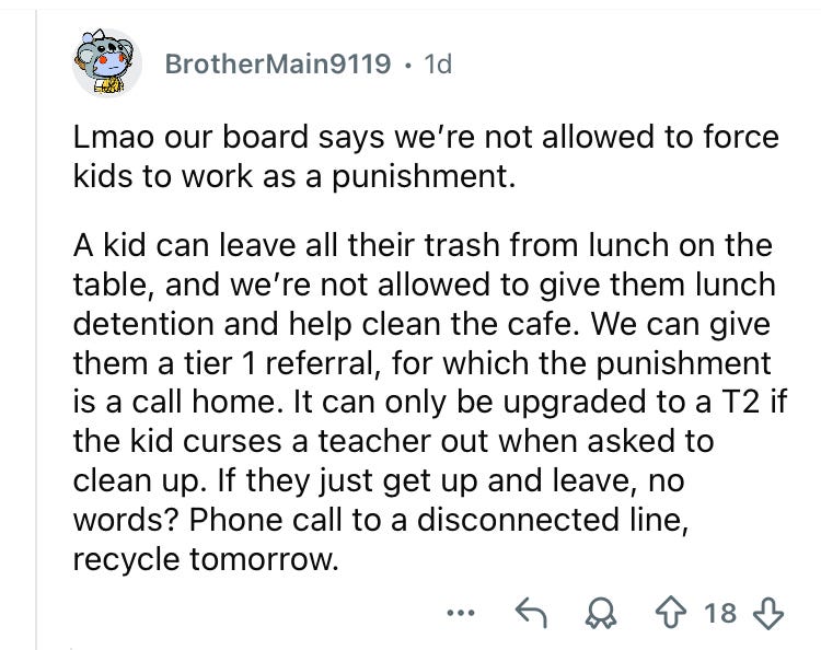 I’m a middle school Civics teacher (and I teach 3 Research blocks) and I must admit that the plague of cheating and total illiteracy and serious behavioral difficulties that I read about (assaults on students and staff, extreme and repeated verbal disrespect, threats of serious violence - all remaining unpunished due to new administrative priorities which I will cover in more detail in Part 2) aren’t really a part of my daily reality. They’re huge problems in many public school systems, which are now often less focused on educating students, and more focused on gobbling up resources and protecting staff from termination and accountability.