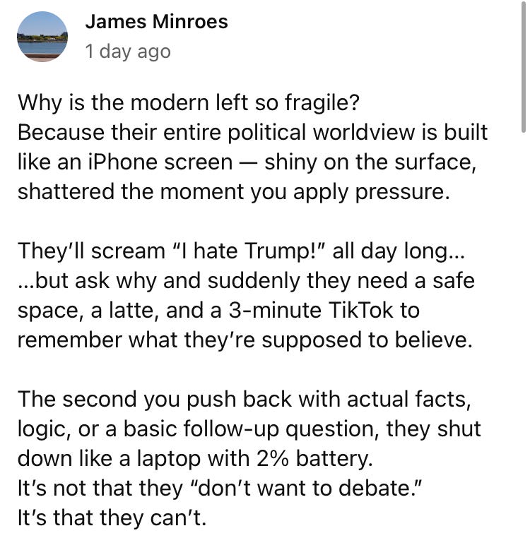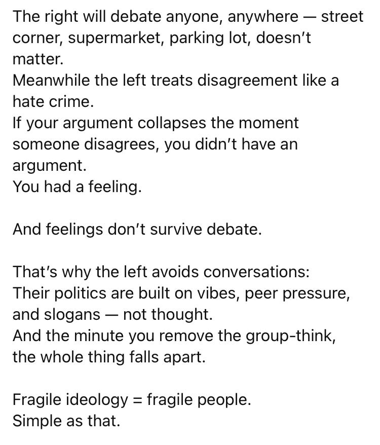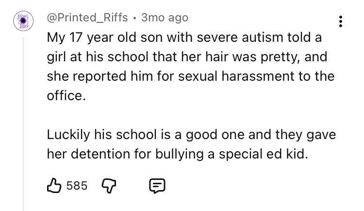 I’ve been thinking about our essential psychological weakness as a society for some time, and I’ve landed on it being an example of feminization — comfort and luxury are ontologically feminine because they are indulgent, and taken to an extreme they corrode social trust and discipline. Women in particular have been key agents of this, not least because of feminism, but because they have turned society inward in the name of empathy. But empathy and compassion taken to extremes undermines actual progress. It creates a society of dependents. Education being such a mess is in no small part because of this impulse, driven primarily by women because they are the majority of teachers. While feminized aspects of society have male participants, the agents of weakness are, squarely, elite women. And their beliefs trickle down to poor women who are not inoculated from their bad choices as well as elite women. The feminist apparatus is the ultimate source of luxury beliefs. I say this having once been a feminist and having been indulgent and weak. It’s funny how an ideology that claims to be about female empowerment has done nothing but foment fragility and become a system of downside protection for women.