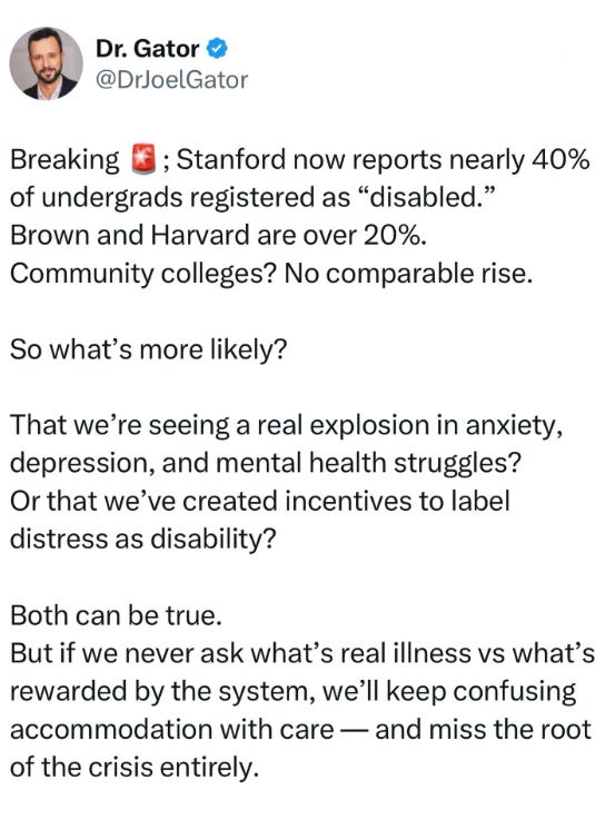 Responsibility and kinship and trust aren’t just less important than they used to be - they’re actively corrosive to the larger aims of the administrative state (which is now inextricably linked to large corporations and universities and legacy media outlets… we call it ‘the Blob’). As communities have changed and weakened and died, the old standards of behavior which were upheld by them haven’t vanished, exactly, but they’re much weaker versions of their former selves. There simply is not the same social or reputational penalty for being lazy or rude or promiscuous or antisocial or gluttonous. I suspect it’s a public goods problem: the benefit for any single person to uphold norms (to express disapproval or to penalize a person socially) is less. This certainly applies for people expressing doubt about claims of victimhood or disability (which we’ll get to shortly). We live in larger systems, more anonymous, more technologized, and so no one feels any personal urge to uphold community standards. To try would make you an oddity, a “hater”, uptight.