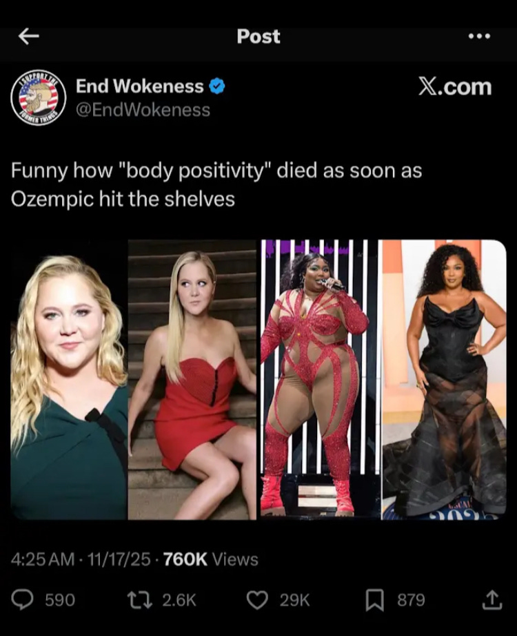 Then GLP-1 medications hit the consumer pharmaceutical market (by the way - it’s debatable whether there should even be such a thing as a consumer pharmaceutical market) like a nuclear bomb. I won’t go into the intricacies of public backtracking or the timelines or the frequent combination of sudden silence + new, thinner selfies. Suffice it to say, that when an easy tool emerged to help women (richer women, mostly) control their weight, the need for the social loophole mostly vanished. So the loophole did as well. Pay attention here: this means that, in some sense, all of the furor around fat liberation and “fat is beautiful” and “fatphobia” was a feminine social manipulation strategy. Hundreds of thousands of people really claimed to believe certain things and in most cases I think they did believe, on some level. Yet this was mostly revealed to be a campaign to build and preserve a wide (it would have to be wide, for the beneficiaries to pass through) social loophole, to reward fat women with jobs and status and dates (even if that never really worked out) without them having to lose weight.